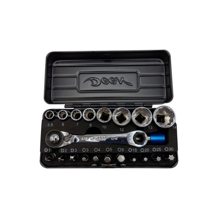 - 一組包含 1/4SQ 套筒、批頭和棘輪的緊湊金屬盒。